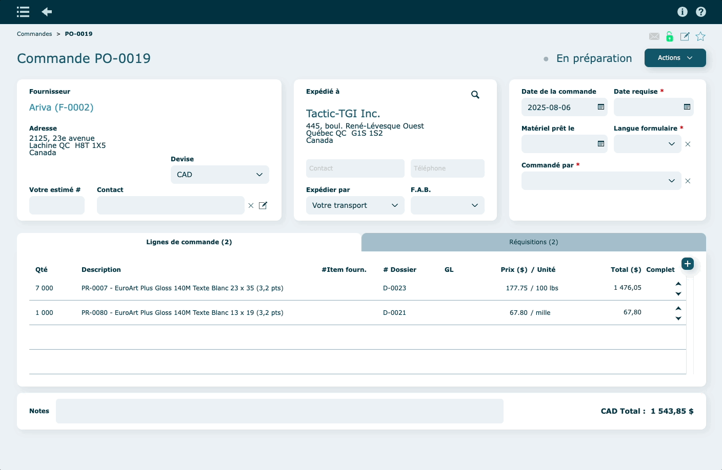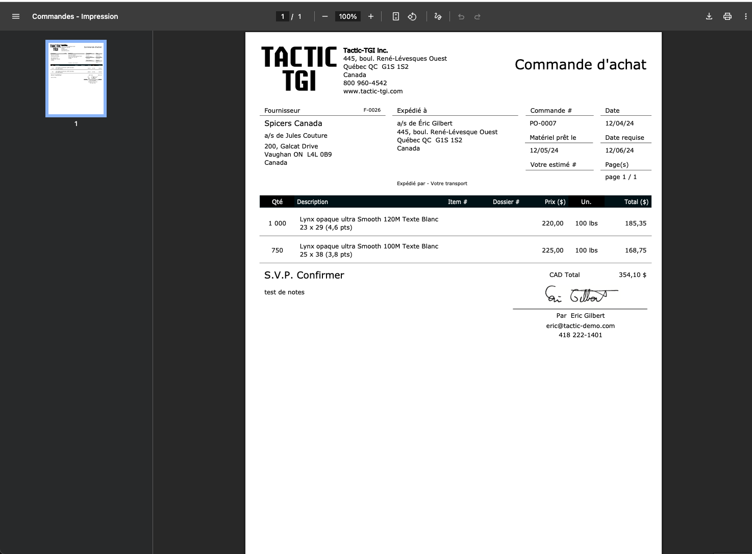 Un outil essentiel pour créer des bons d’achat de sous-traitance ou de matières premières. Pourquoi ne pas imprimer les formulaires ou mieux encore les sauvegarder en format pdf avec envoi automatisé en pièce jointe d’un courriel? En quelques clics, tout est réglé.