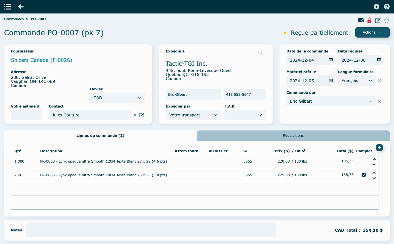 Lorsque le magasiner reçoit les items, il doit se rendre dans un des items et cocher la case "Complet" sur tous les items reçus. Si une ou des réquisitions étaient liées à cette commande, leur statut changera pour Reçu.