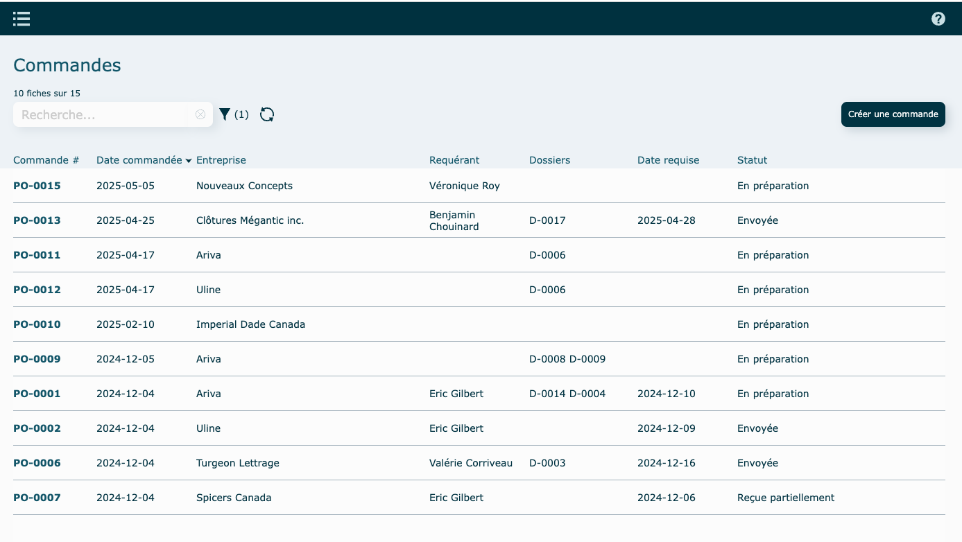 Par défaut, le filtre est à statut : En préparation + Envoyée + Reçue partiellement.