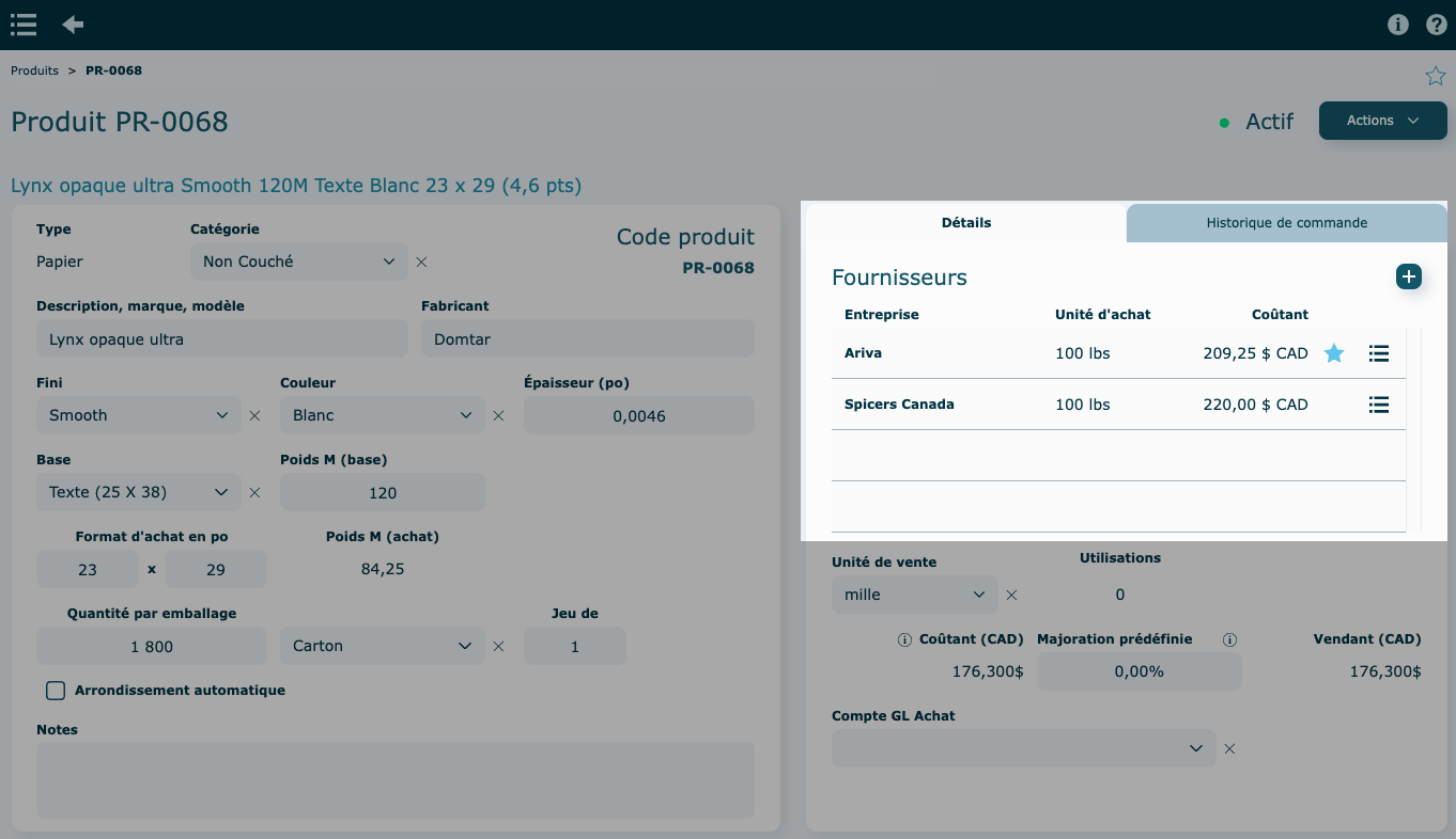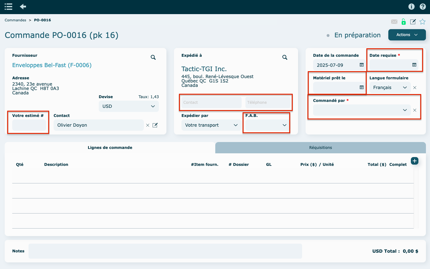 Pour changer de fournisseur, vous devrez supprimer les lignes et les refaire manuellement. Au besoin, vous rendre dans le produit en question pour ajouter un second fournisseur en plus de celui qui est choisi par défaut (favori).