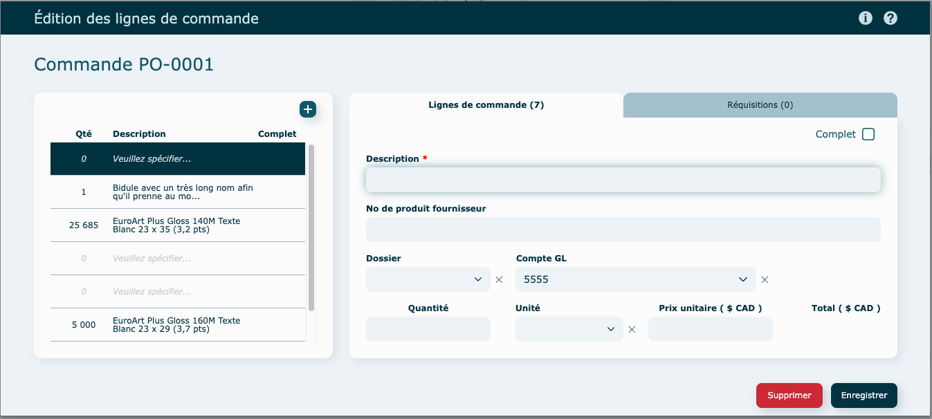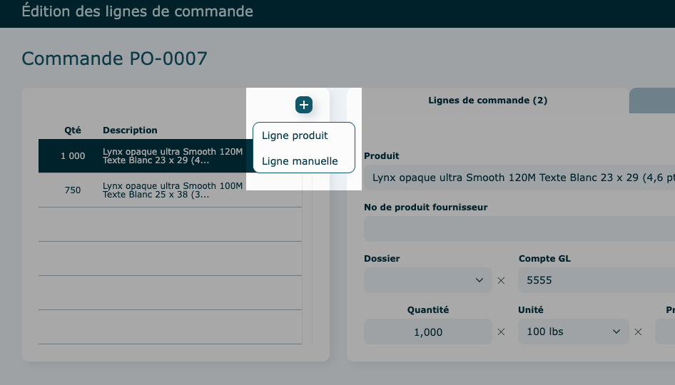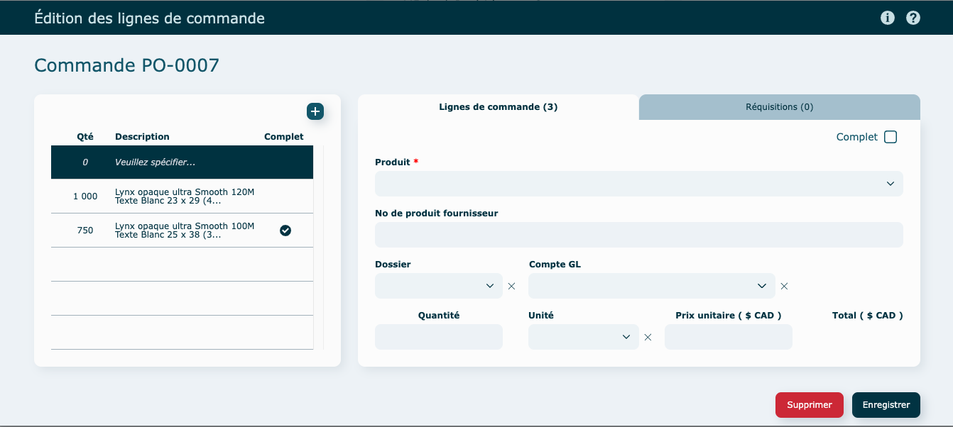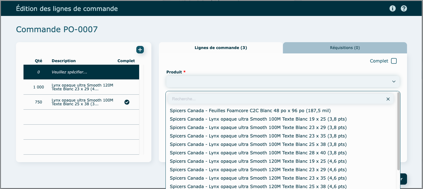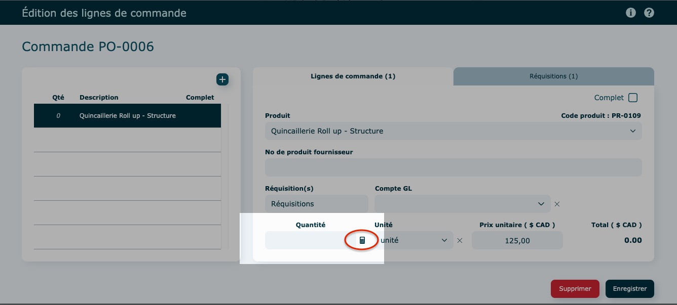 Cliquer sur la ligne du produit, puis cliquer sur le bouton Calculatrice afin de remplir automatiquement les quantités des lignes de commande à partir des réquisitions associées. Si vous ne commandez pas la même unité que celle utilisée pour faire la soumission et la réquisition, entré simplement la quantité et changer l'unité (ex : soumission aux pieds carrés mais achat en rouleau).