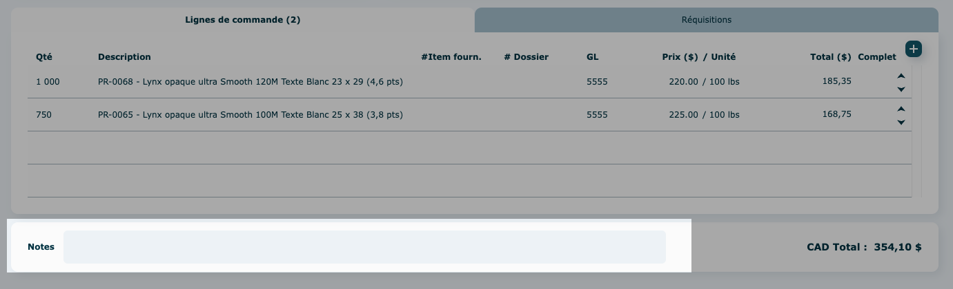Ajoutez une note au besoin, dans le bas de la fenêtre de commande. Elle se retrouvera sur le formulaire envoyé au fournisseur.