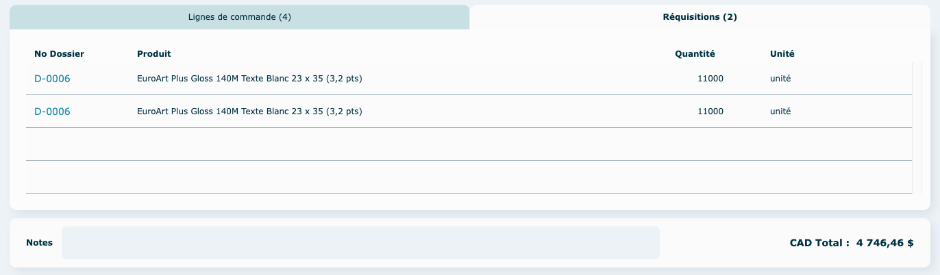 Affiche les réquisitions liées à la commande, lorsque celles-ci ont été utilisées lors de sa création.