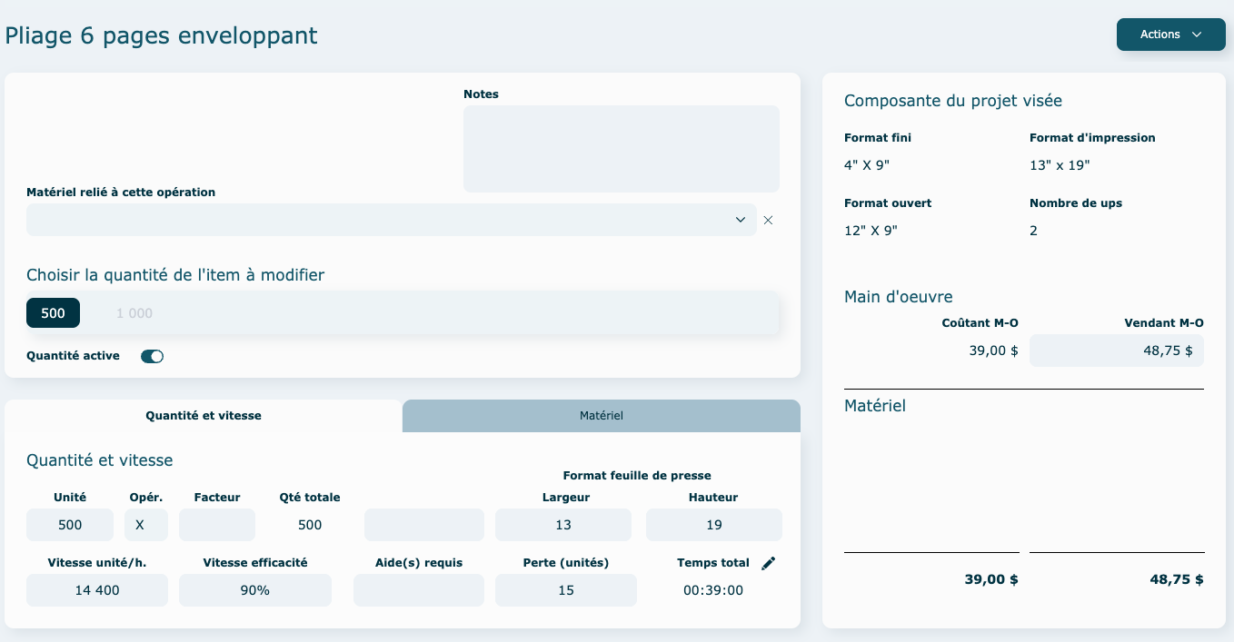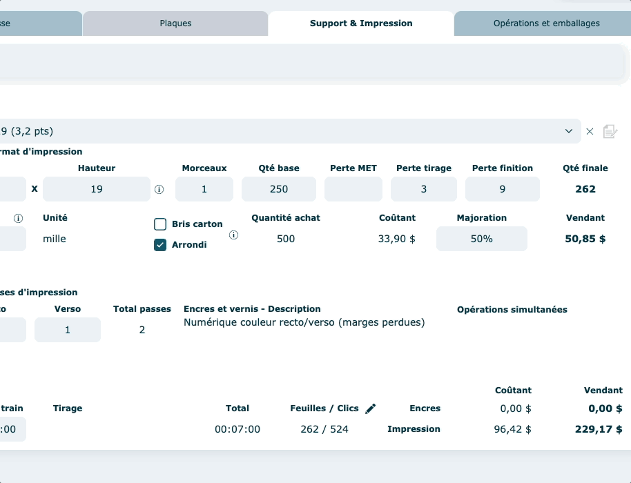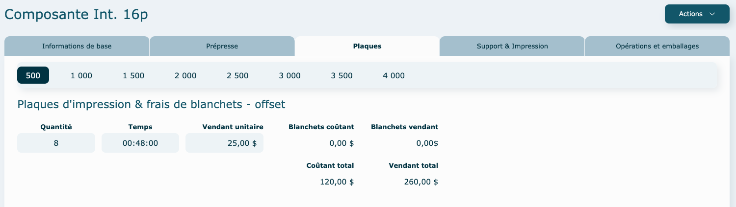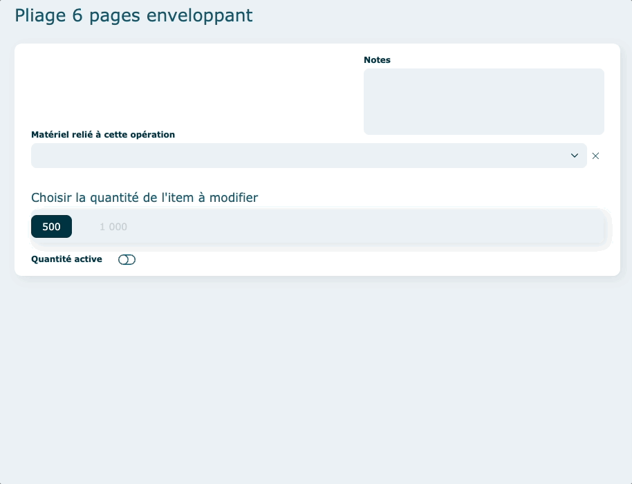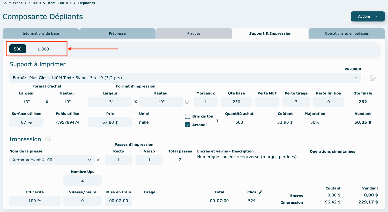 Vous pouvez choisir d'activer le calcul pour toutes les quantités ou juste pour certaines (exemple : au-delà de 500 dépliants, vous voulez faire plutôt une demande de prix à un fournisseur externe en sous-traitance, vous allez donc désactiver la quantité de 1000 dans l'exemple ci-dessous).