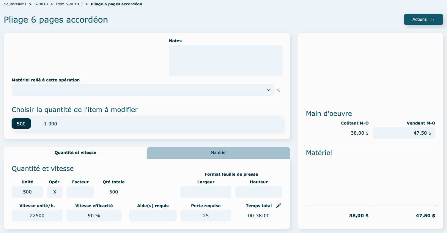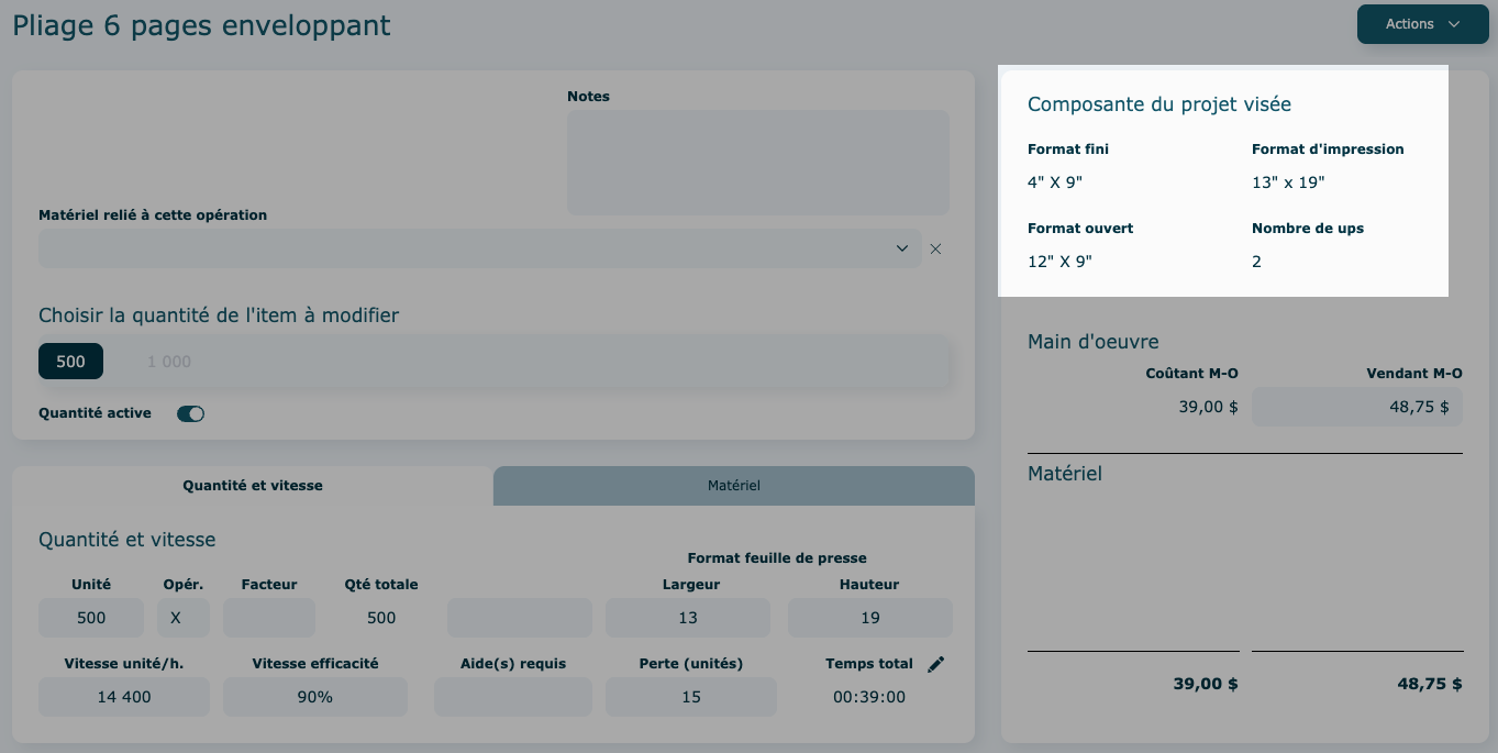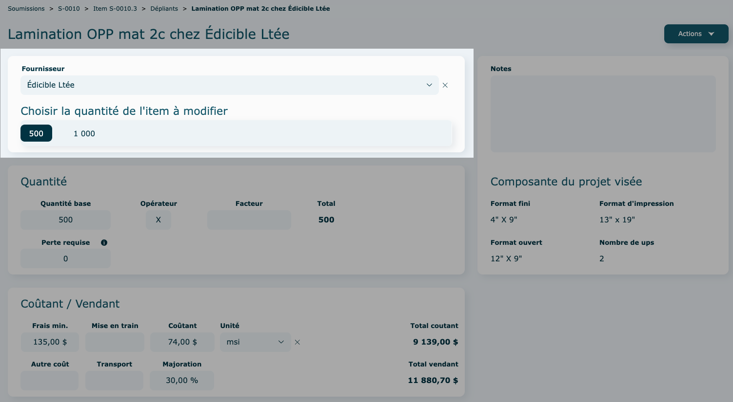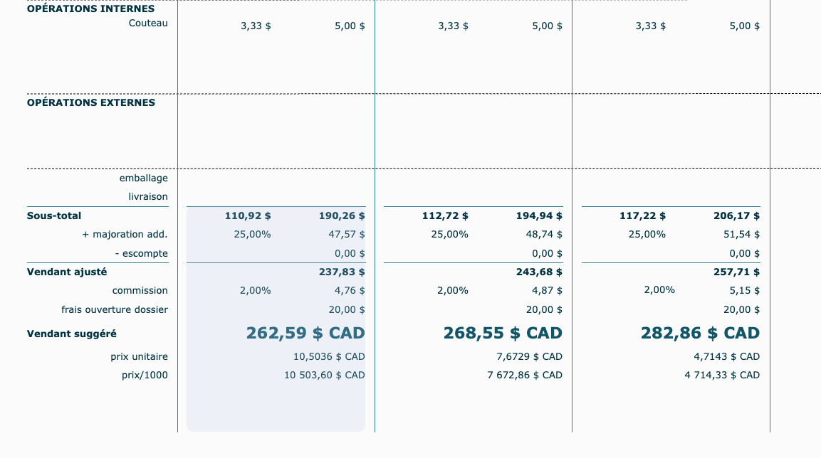Vous pouvez choisir d'activer le calcul pour toutes les quantités ou juste pour certaines (exemple : au-delà de 500 dépliants, vous voulez faire plutôt une demande de prix à un fournisseur externe en sous-traitance, vous allez donc désactiver la quantité de 1000 dans l'exemple ci-dessous).