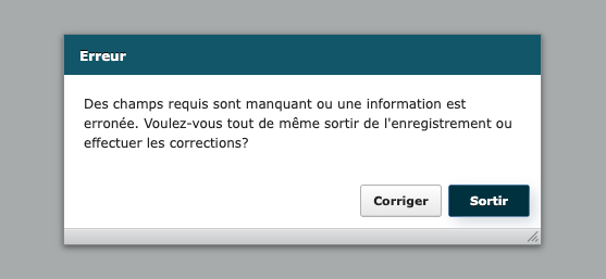 N'oubliez pas de remplir tous les champs obligatoires. Si des champs sont manquants, vous verrez un message lorsque vous sortirez de la soumission en cours. Vous pourrez cliquer sur Corriger pour voir les champs en surbrillance (contour rouge). Voir section Composantes.