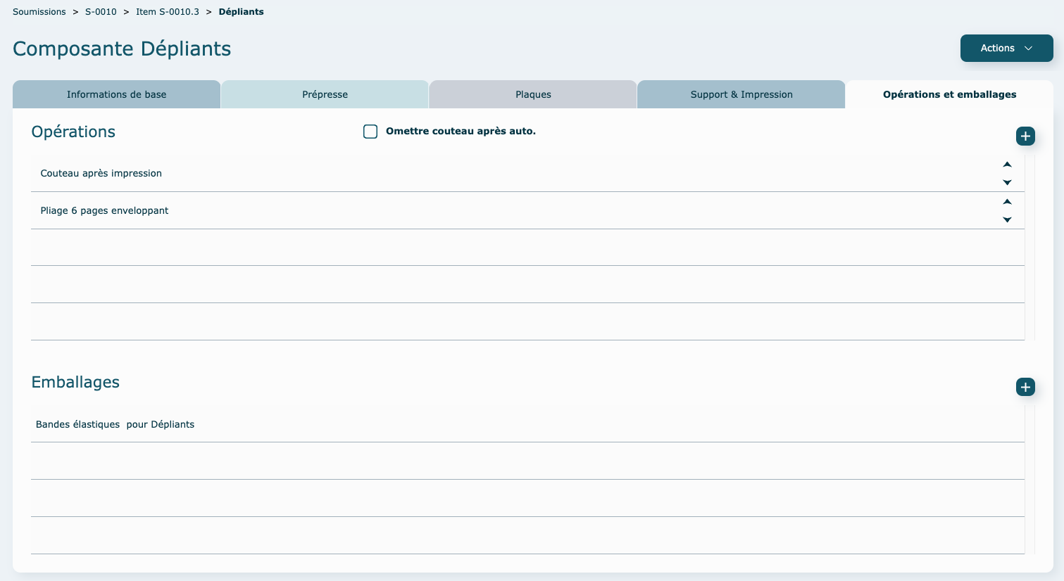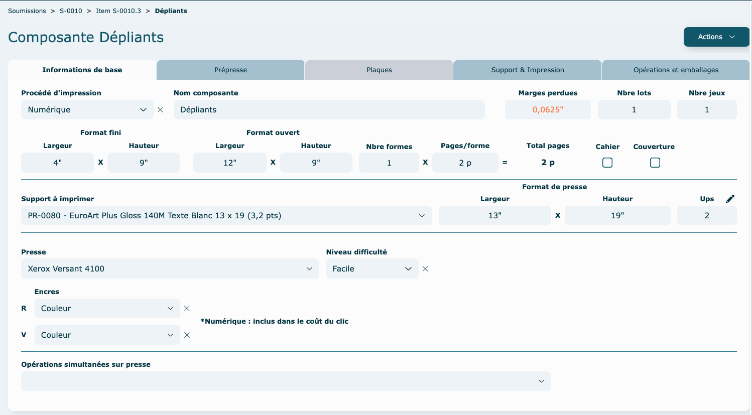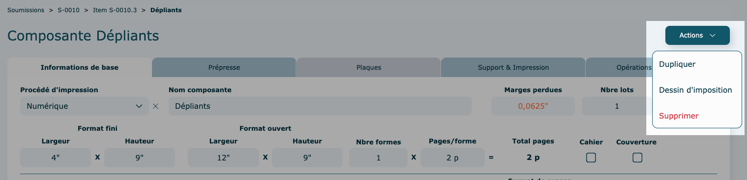 À tout moment il est possible de Supprimer, Dupliquer une composante, en passant par le menu Actions. L'enregistrement des données se fait de façon automatique, dès que vous sortez d'une case.