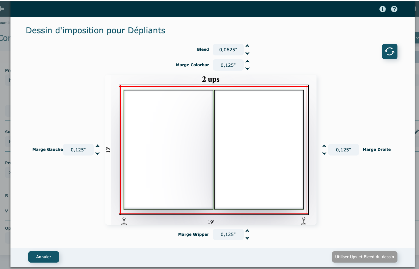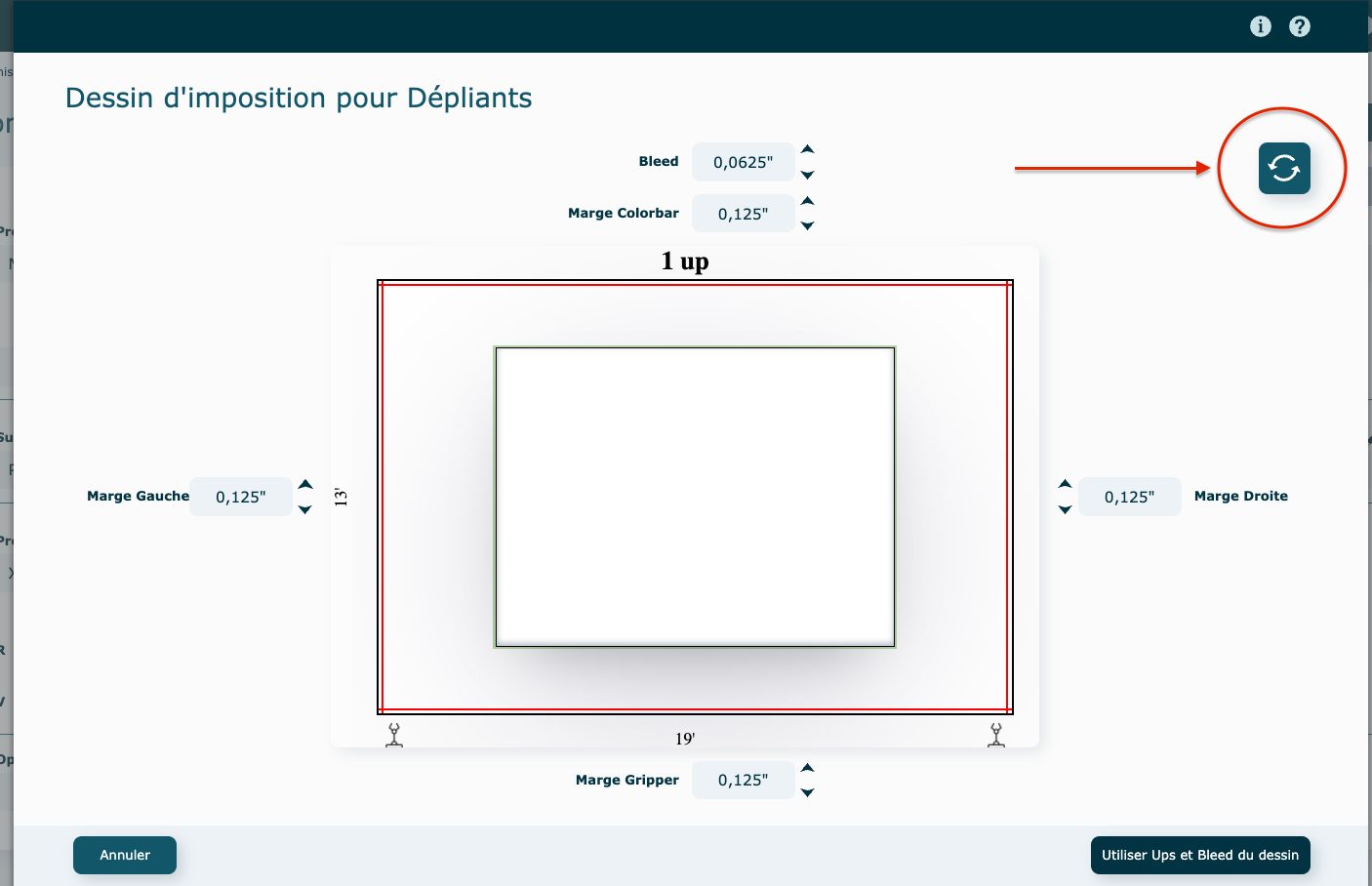Les valeurs des marges et du bleed peuvent être modifiées selon vos besoins. En cas d’ajustements, cliquez sur Utiliser Ups et Bleed du dessin pour valider les modifications.