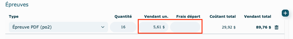 Le prix vendant unitaire et les frais de départ proviennent des standards des épreuves, mais vous pouvez également figer un montant manuellement.