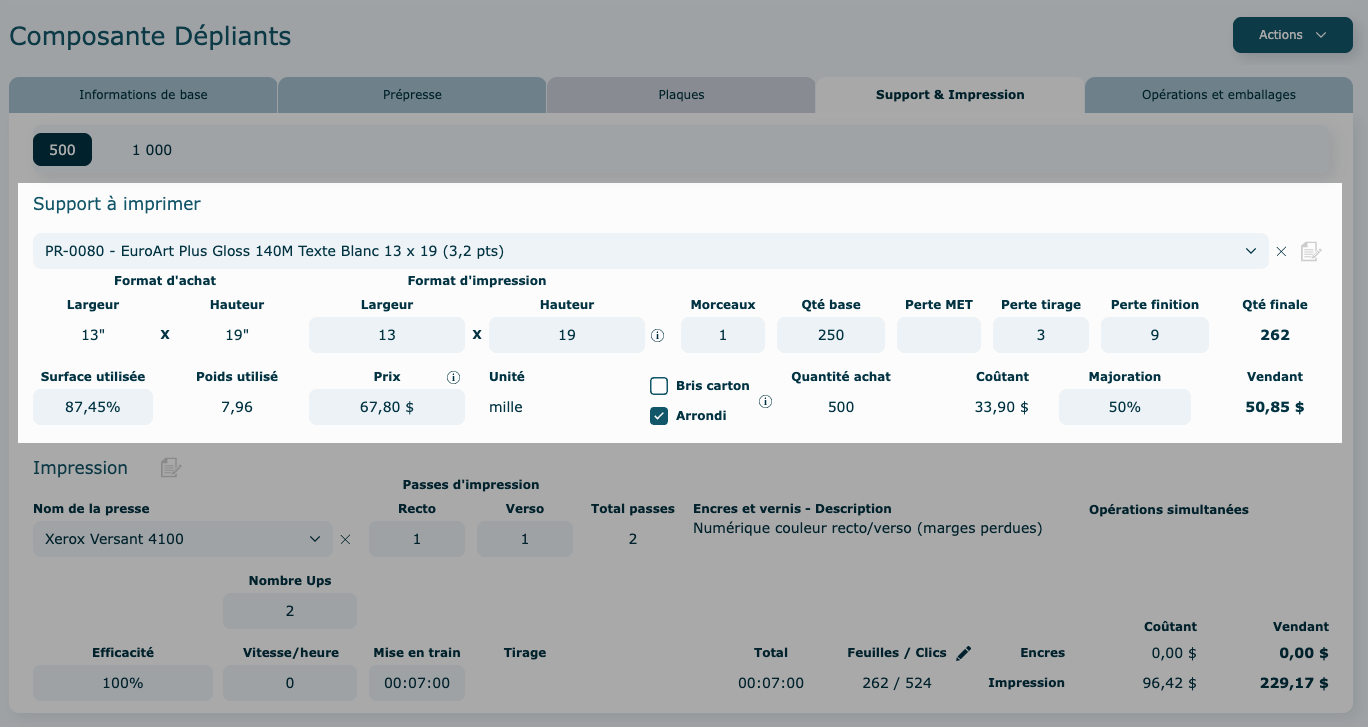 Exemple onglet Support & Impression