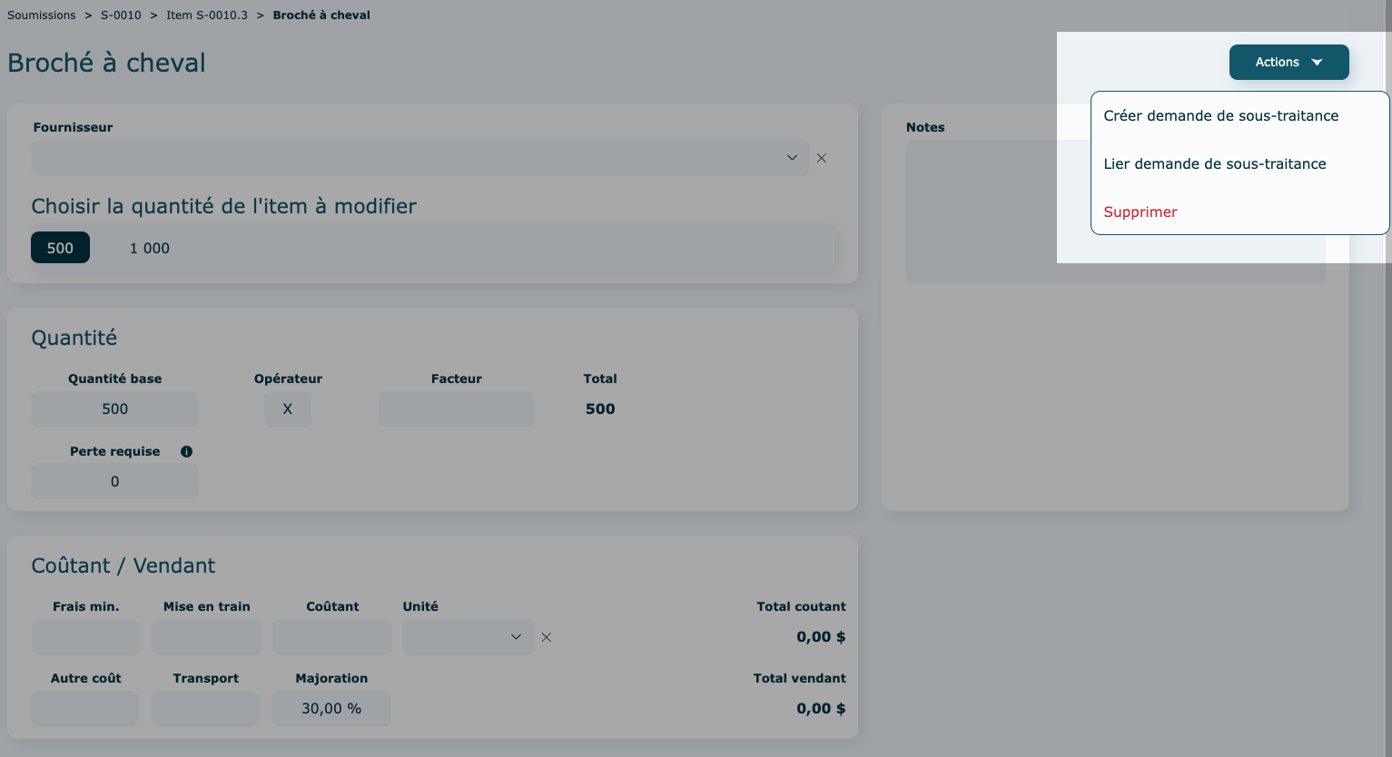 Pour créer ou ajouter une demande de sous-traitance , cliquez sur le bouton Actions