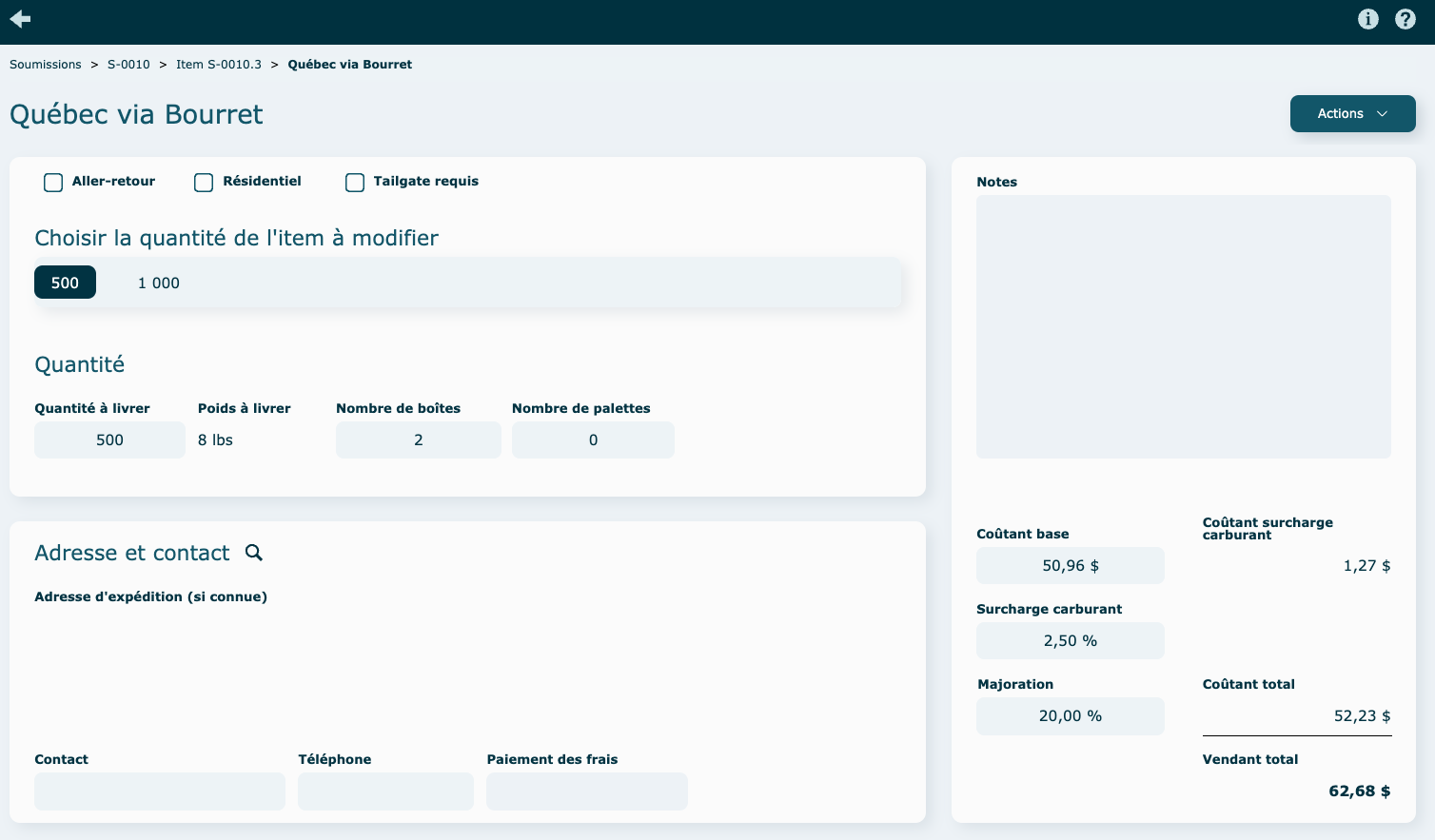 Pour modifier et/ou supprimer un transport, cliquez sur sa ligne pour l'ouvrir et pour le supprimer, appuyer sur Supprimer dans le menu Actions.