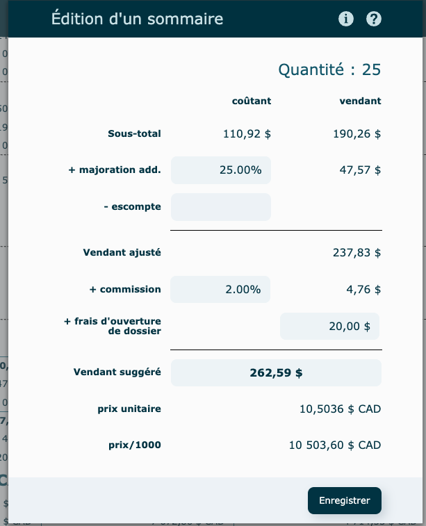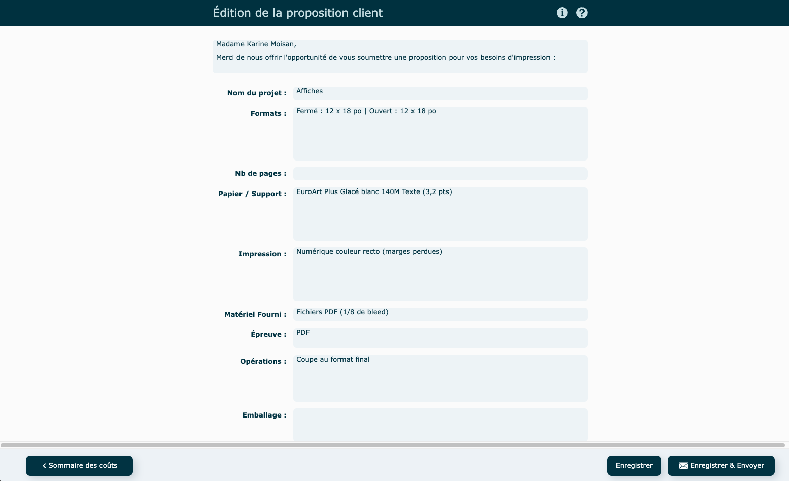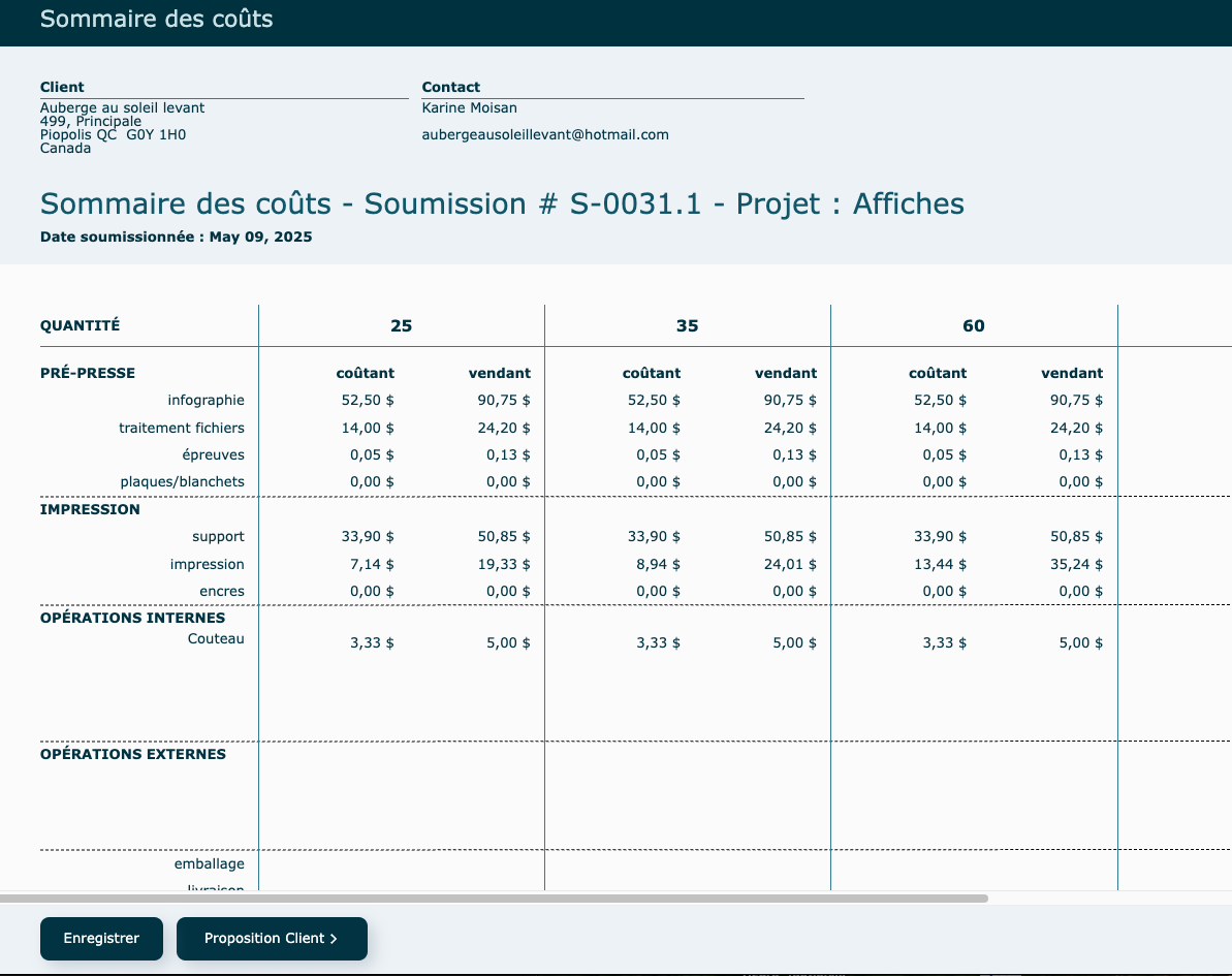 Une fois vos coûts validés, vous avez la possibilité d'Enregistrer pour confirmer et fermer la fenêtre ou de valider la proposition au client.