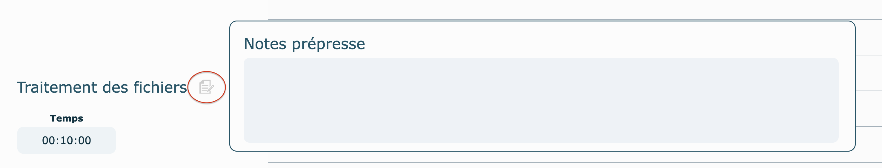 Des cases de notes sont disponibles pour chaque section de la soumission (Prépresse, Infographie, Impression, Support) et seront associées au dossier de production correspondant.