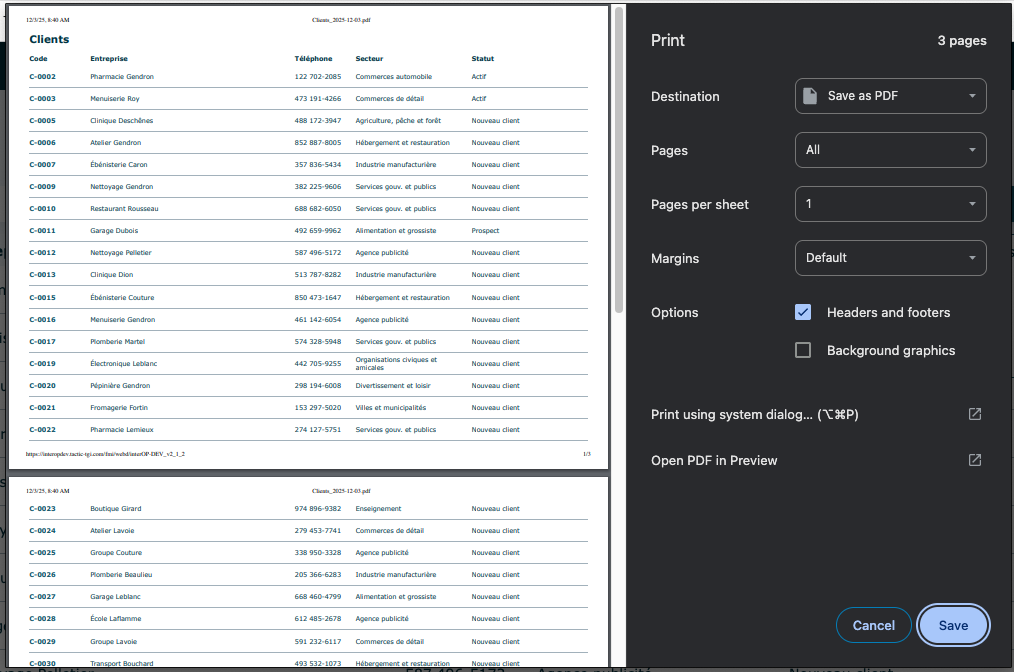 Pour produire un pdf, vous pourrez simplement sélectionner votre application qui visionne vos pdf et faire le bouton Enregistrer.