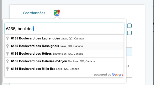 Cliquez sur le bouton Google maps pour rechercher votre adresse et faire remplir la fiche automatiquement.
