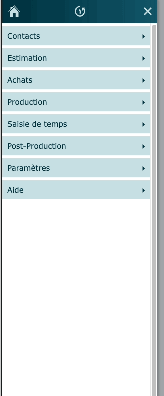 Le menu principal est accessible à travers le logiciel dans la plupart des écrans au coin supérieur gauche de l'écran. Il permet la navigation entre les les différents modules.