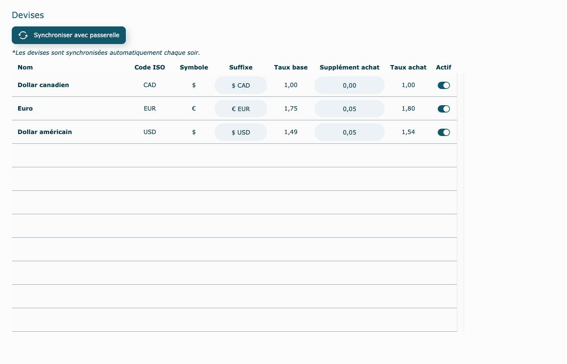 Le bouton Synchroniser avec Passerelle récupère les taux en vigueur pour la journée. Ces taux sont actualisés une fois par jour via la passerelle. Ainsi, même si vous cliquez plusieurs fois sur le bouton de mise à jour, les taux resteront inchangés jusqu'au jour suivant.