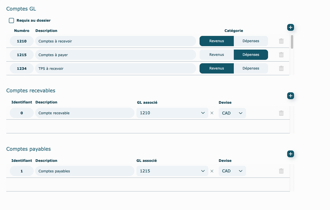 Inscrivez la liste de vos comptes GL (Revenus et Dépenses).