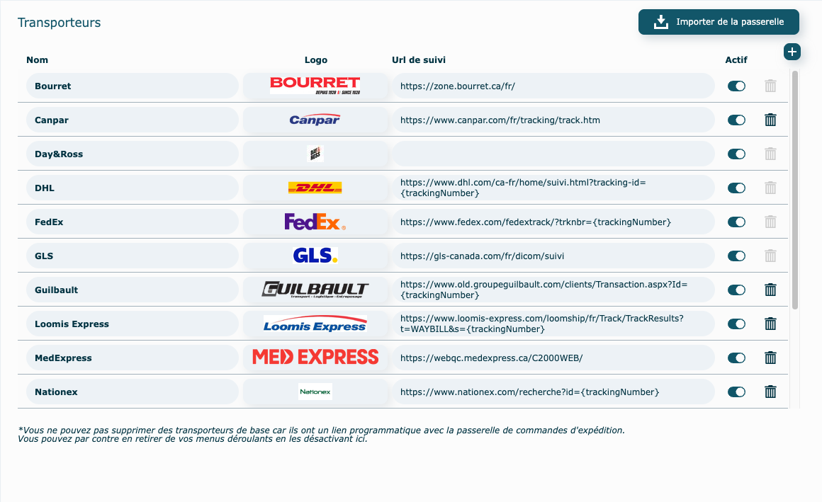 Lorsque ceux-ci sont liés à l'Api Expédition, vous ne pourrez pas supprimer le transporteur, mais vous pourrez le désactiver pour l'exclure de vos menus.