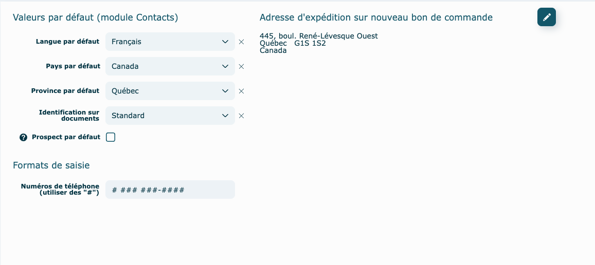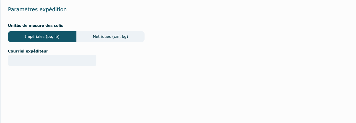 Choisir ici l'unité de mesure habituelle de vos colis (information utilisée sur étiquettes d'expédition) et inscrivez l'adresse courriel de votre département d'expédition. Elle servira lors de l'envoi de confirmation de livraison par courriel ou bien pour passer des commandes à votre transporteur (si abonnement APIs Expédition).