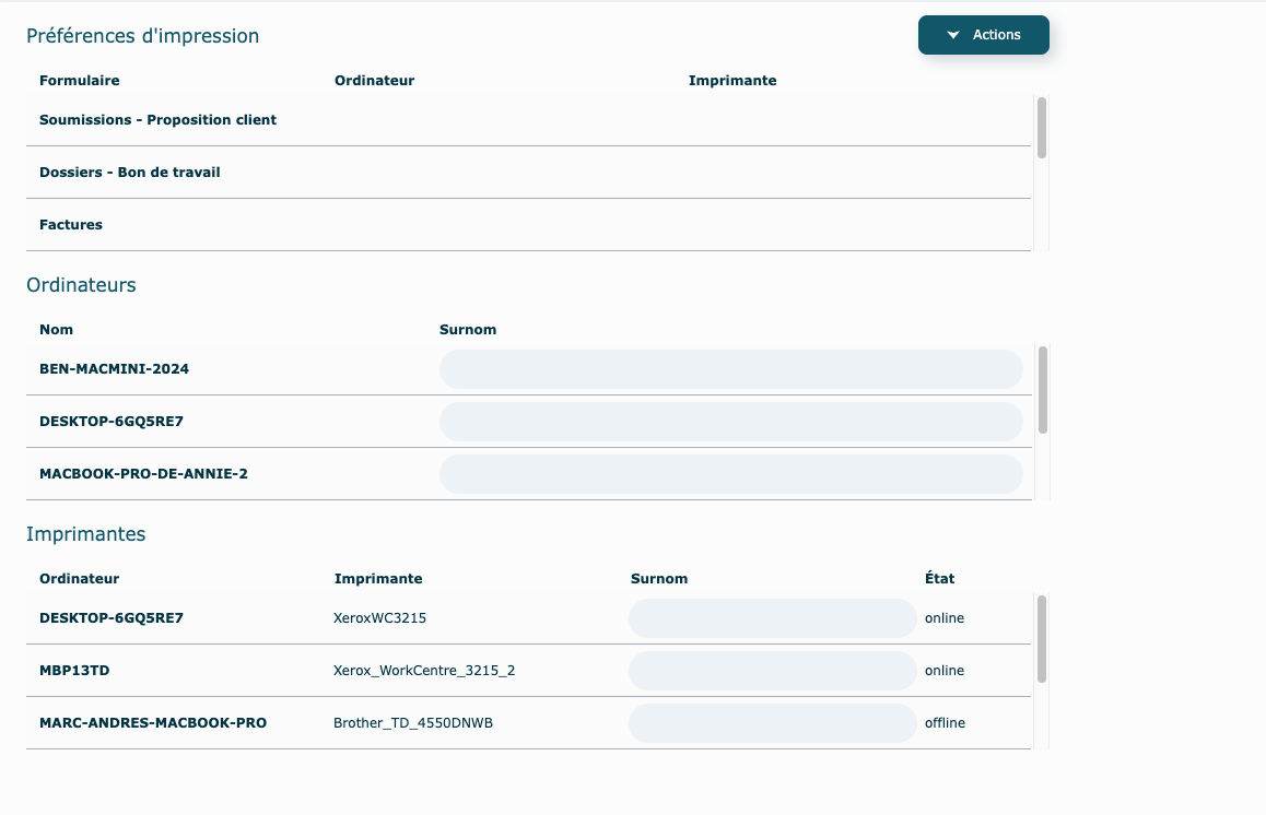 Système de gestion des imprimantes. Lié à votre compte Printnode, choisissez votre ordinateur et sur quelle imprimante vous voudrez imprimer par défaut.