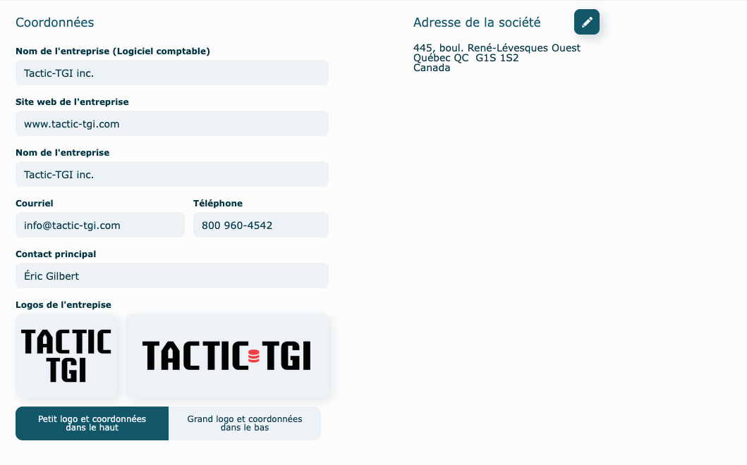Inscrire vos coordonnées d'entreprise , ajouter vos logos et sélectionner le logo à utiliser dans les différents formulaires.