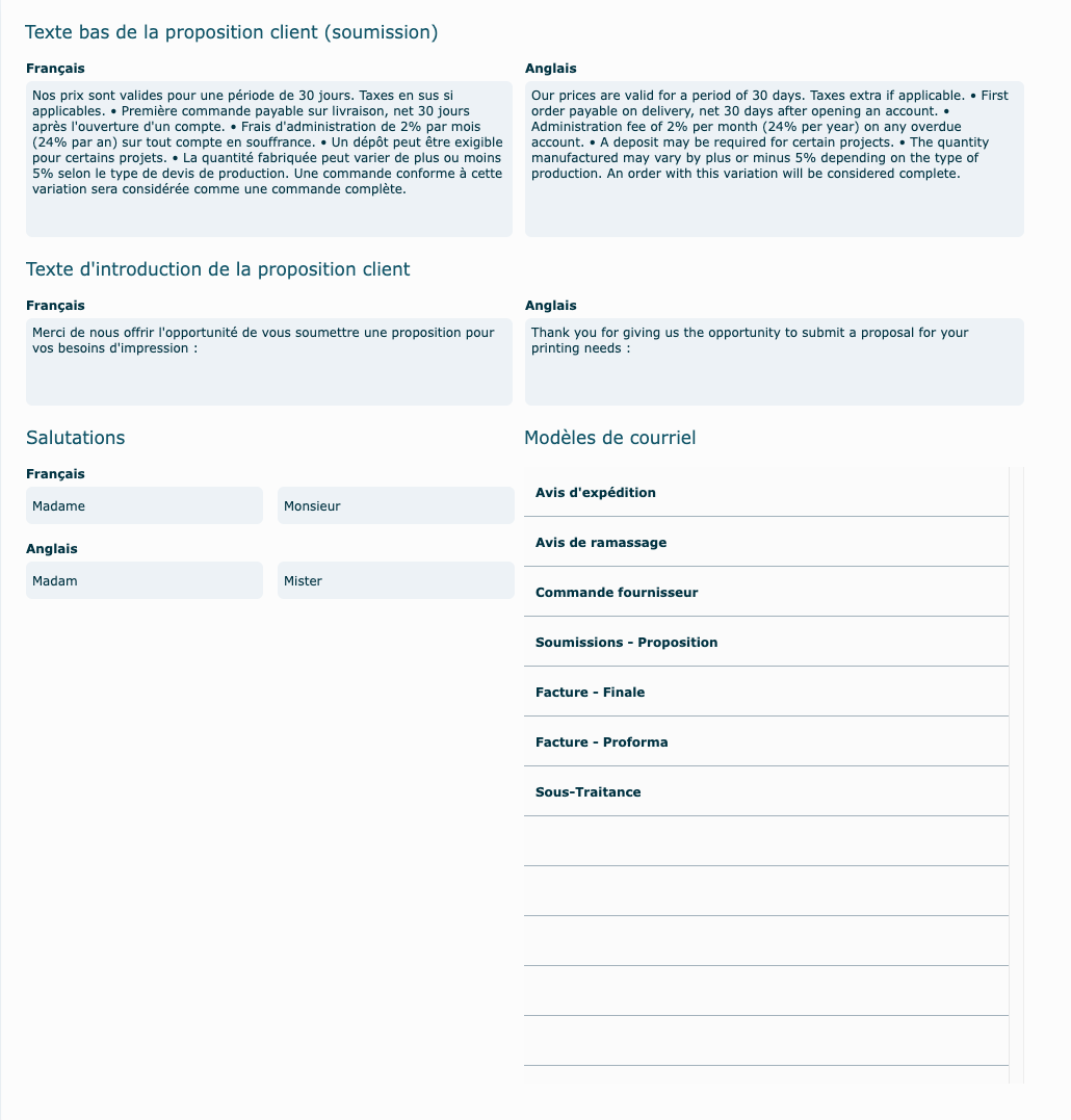 Gérez ici les différents textes/salutations qui apparaitront par défaut sur la proposition aux clients.