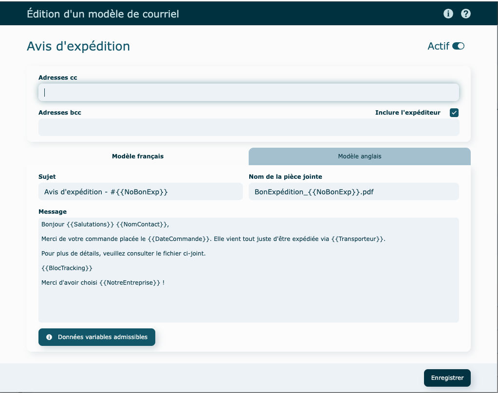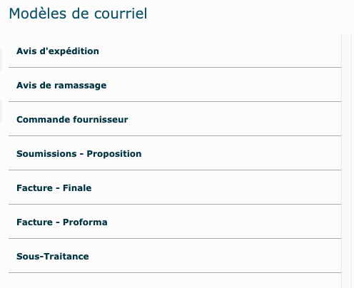 Voici la liste des modèles disponibles et utilisés dans le logiciel lors de l'envoi d'un courriel.