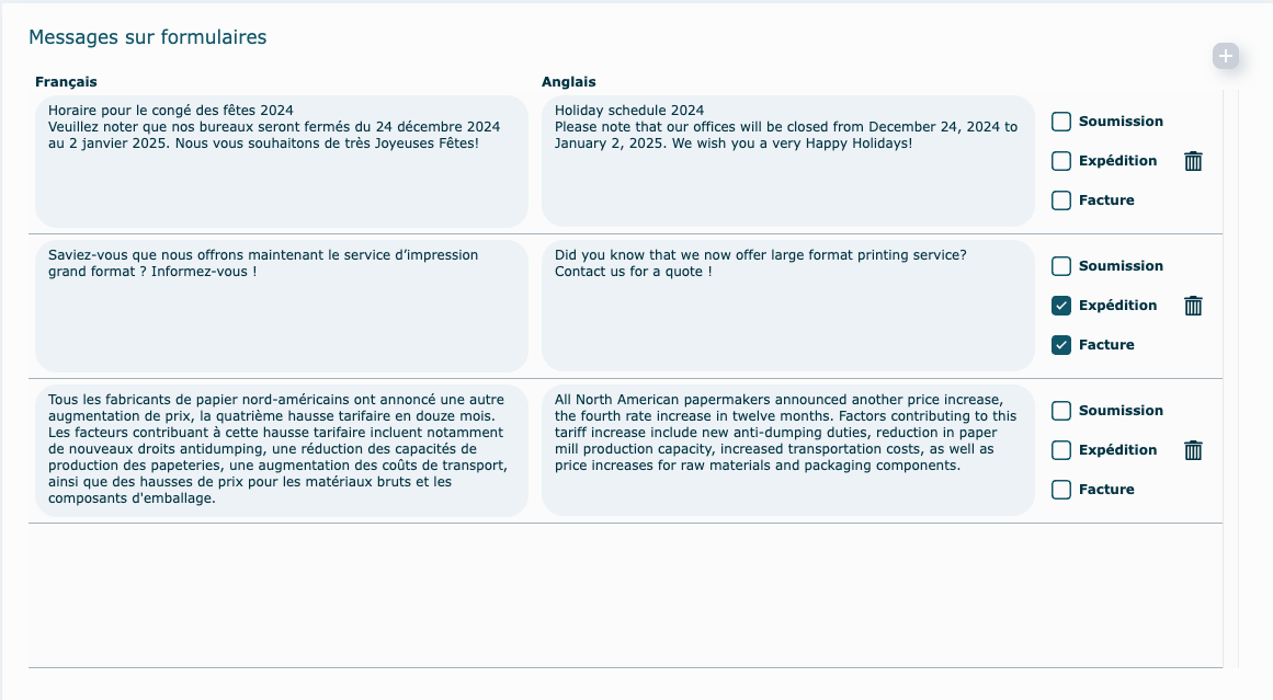 Gérez ici les messages qui apparaitront par défaut sur les formulaires d'envois aux clients.