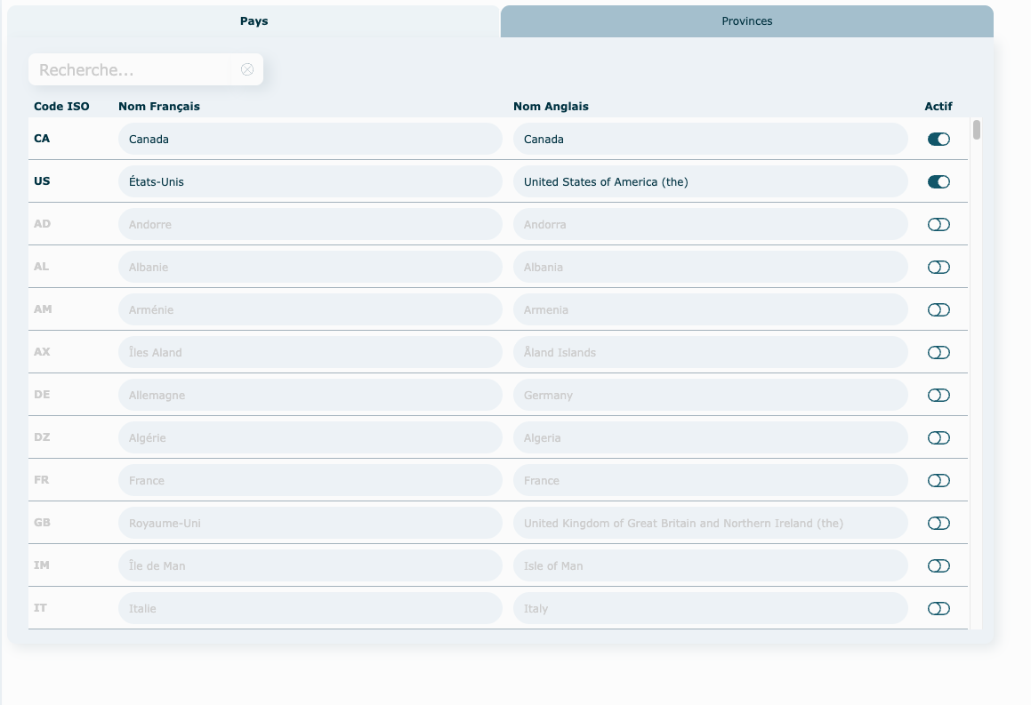 Pour rendre actif un Pays, une Province ou une Devise cliquez sur le bouton au bout de la ligne.
