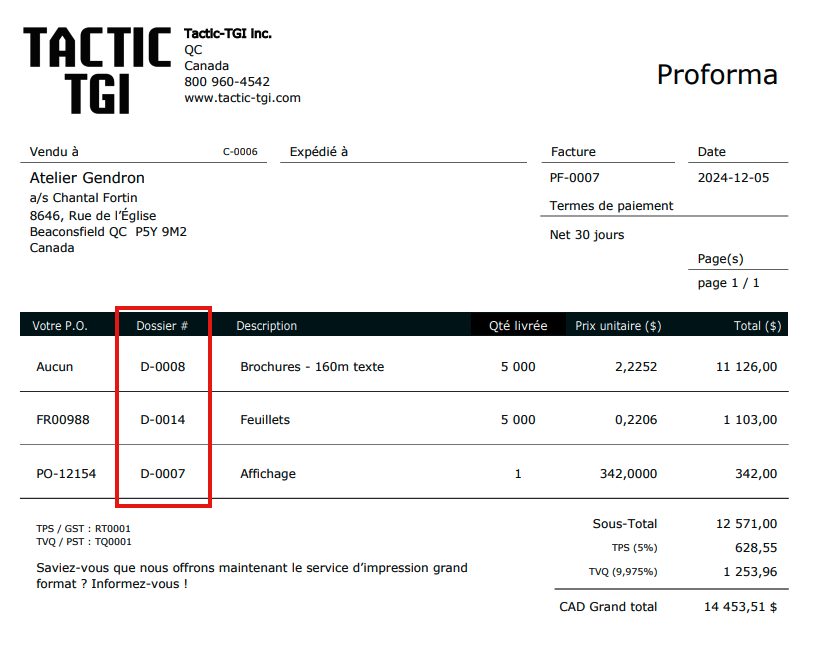 Le module Facturation permet de produire des factures de vente selon la mise en forme souhaitée en rappelant le numéro d’un dossier, ce qui affiche automatiquement le nom du travail, la quantité commandée et le prix unitaire.